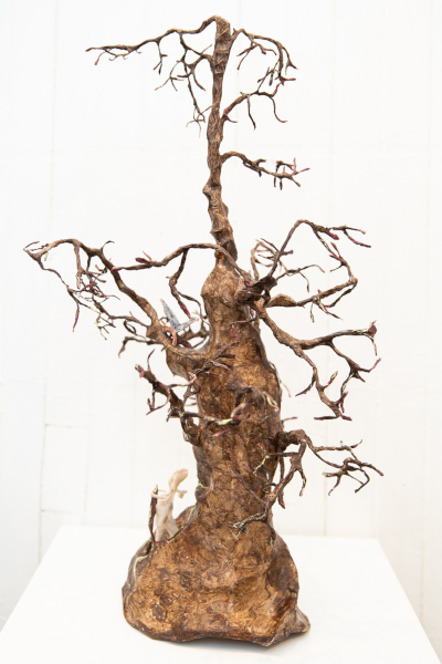 Steel wire, acid free tissue paper, pva, egg tempera, glair, silk organza, silk covered copper wire, hair, beads, water based glue.